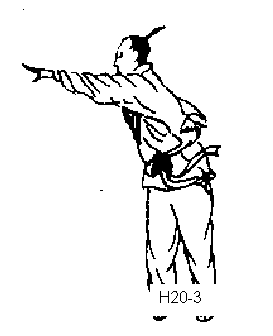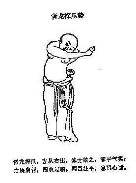 1.2.Khất thân thám chưởng (nhiêng mình xuất chưởng) : quyền phải đưa ra sau lưng (huyệt Mệnh-môn). Quyền trái đưa lên khỏi đầu. Lưng, đầu từ từ nghiêng qua phải. Tay trái vòng qua đỉnh đầu nghiêng theo, tay phải tự nhiên bị vòng ra phía hông. Sau đó toàn thân chuyển sang phải, trong khi hai chân giữ nguyên vị trí. Mắt nhìn đầu bàn tay trái.