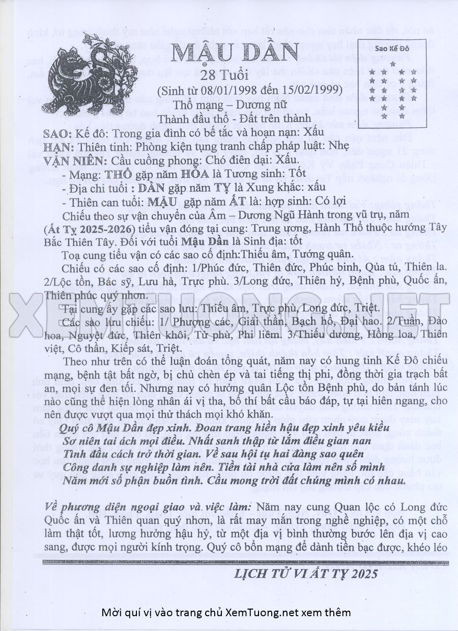 Tử Vi Năm Ất Tỵ 2025 mạng nữ MẬU DẦN
