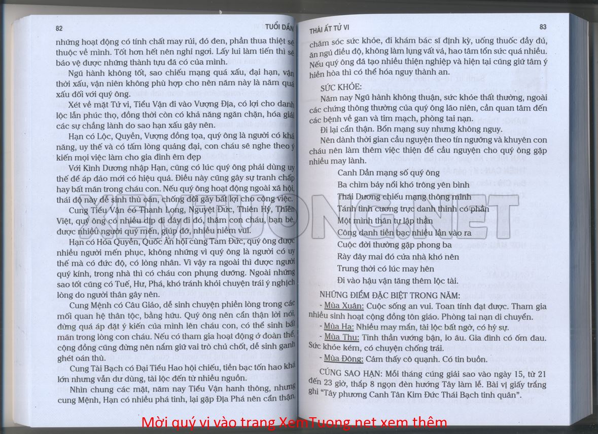 (Lưu ý: Thái Ất Tử Vi được chúng tôi scan từ sách, do đó mỗi tuổi sẽ có nhiều trang, quý vị xem xong hãy nhấn vào trang tiếp theo để xem hết phần tuổi muốn xem. Nếu quý vị xem bằng điện thoại thì hãy kéo qua lại để xem phần bị khuất.)