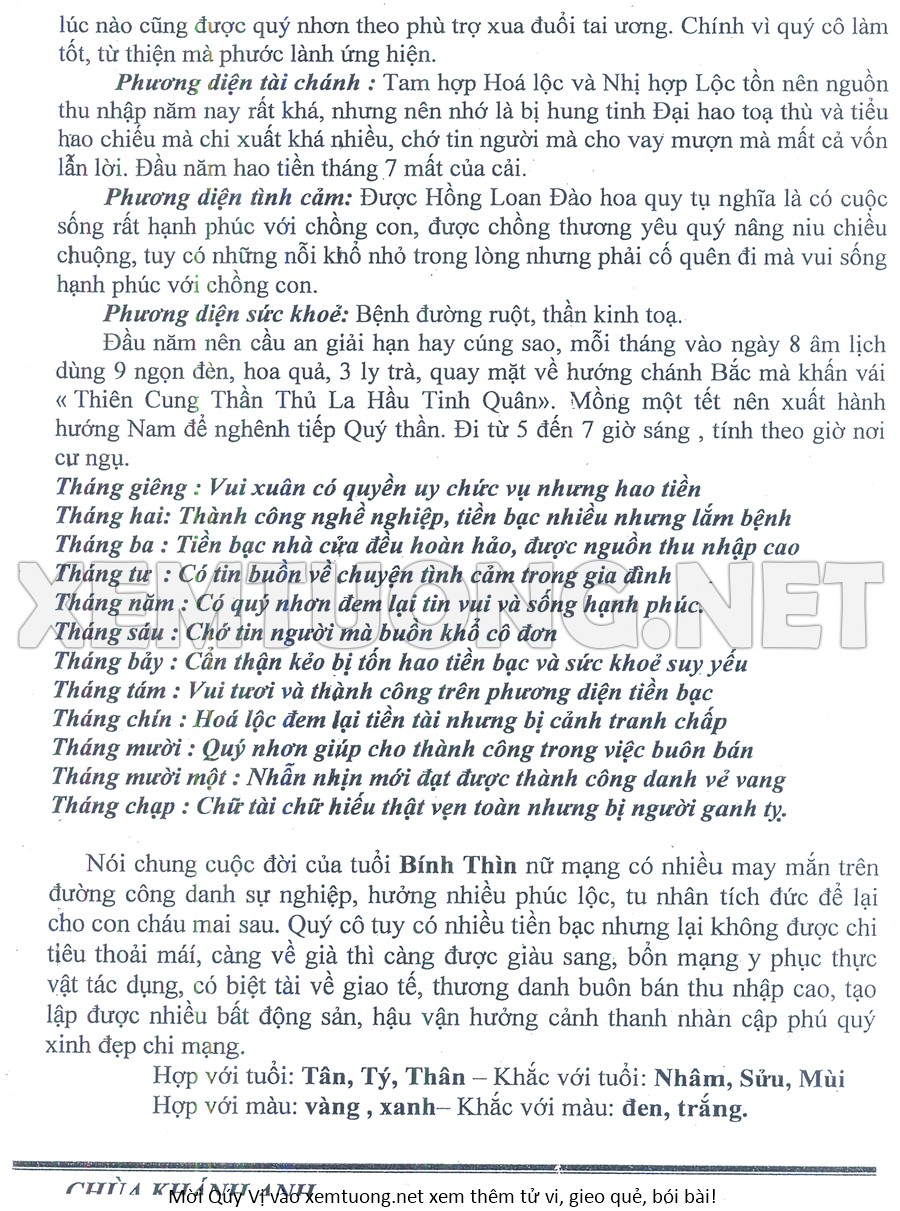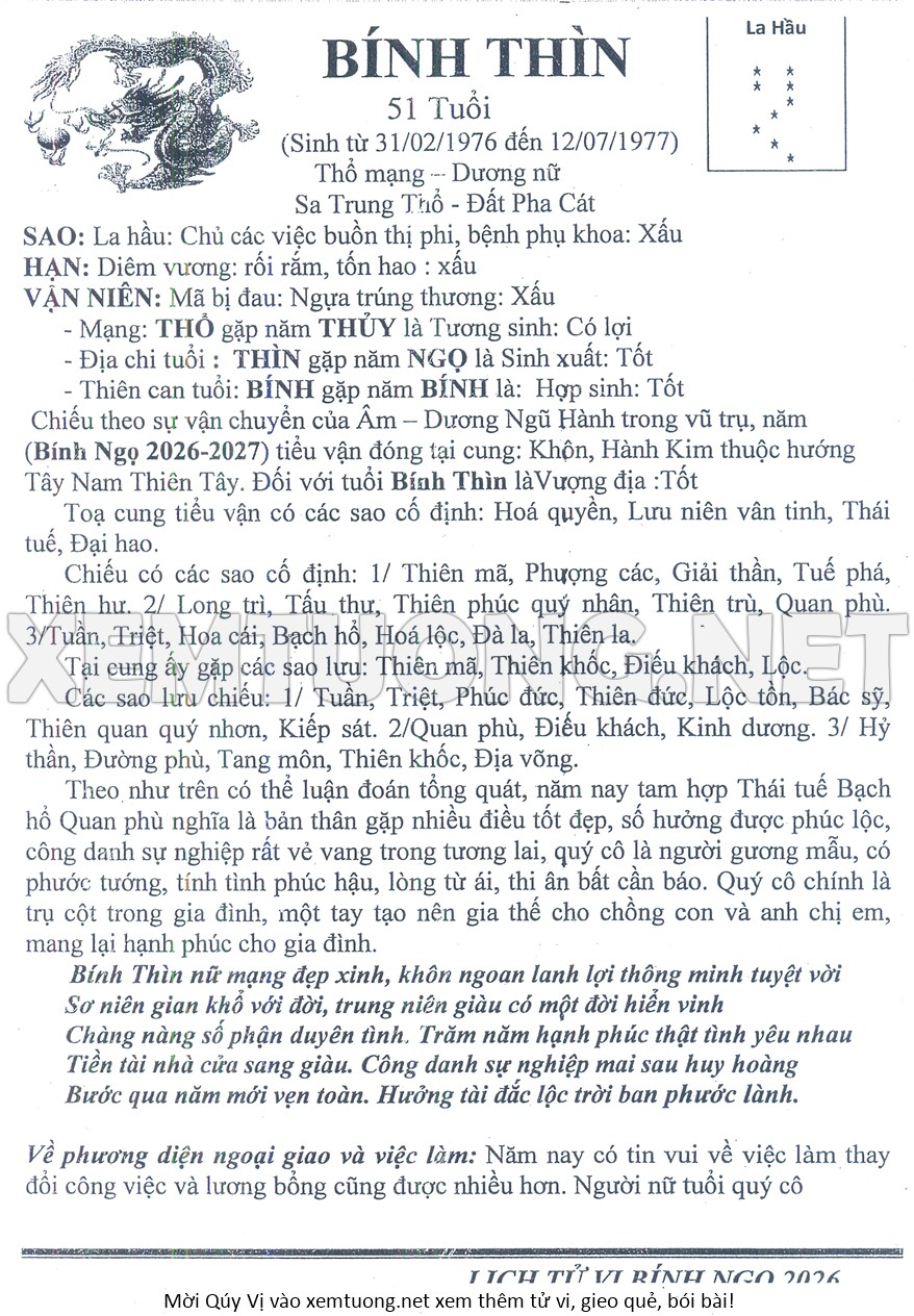 Tử Vi Năm Bính Ngọ 2026 mạng nữ BÍNH THÌN