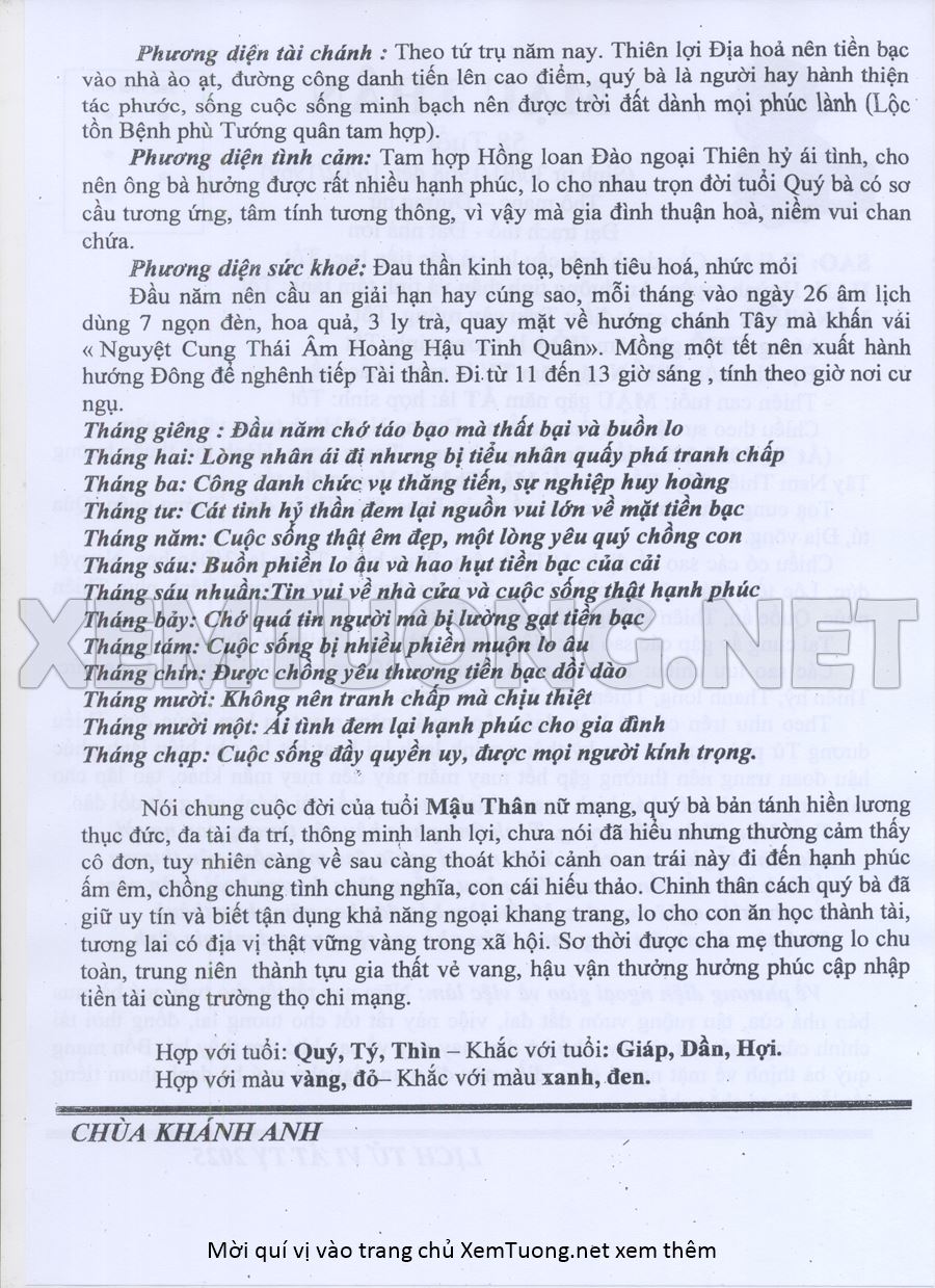 Tử Vi Năm Ất Tỵ 2025 mạng nữ MẬU THÂN
