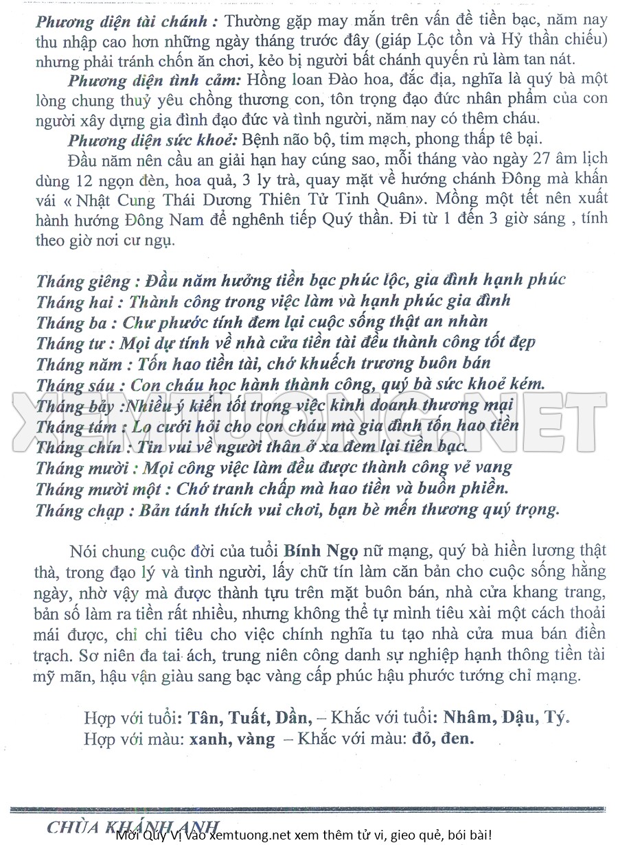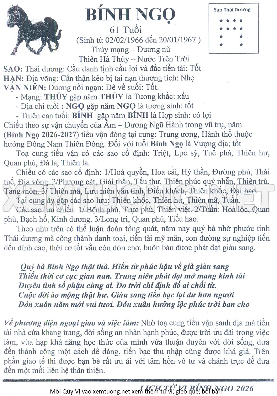 Tử Vi Năm Bính Ngọ 2026 mạng nữ BÍNH NGỌ