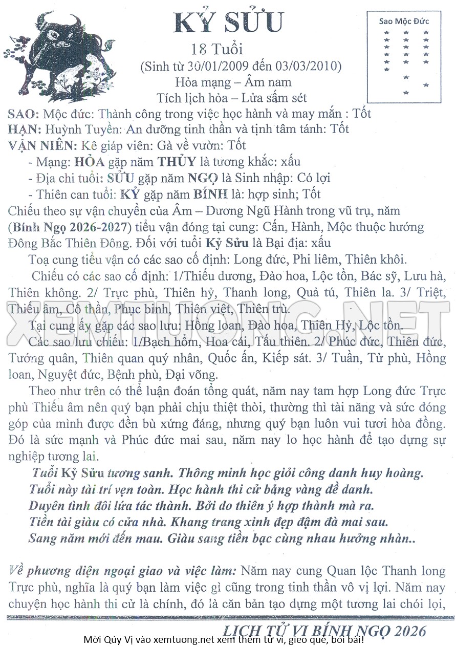 Tử Vi Năm Bính Ngọ 2026 mạng nam Kỷ Sửu