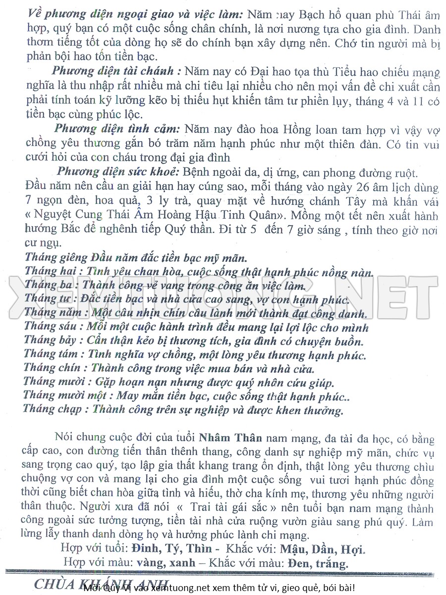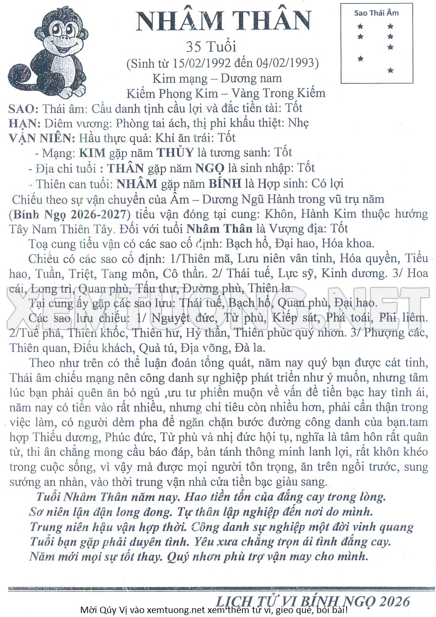 Tử Vi Năm Bính Ngọ 2026 mạng nam NHÂM THÂN