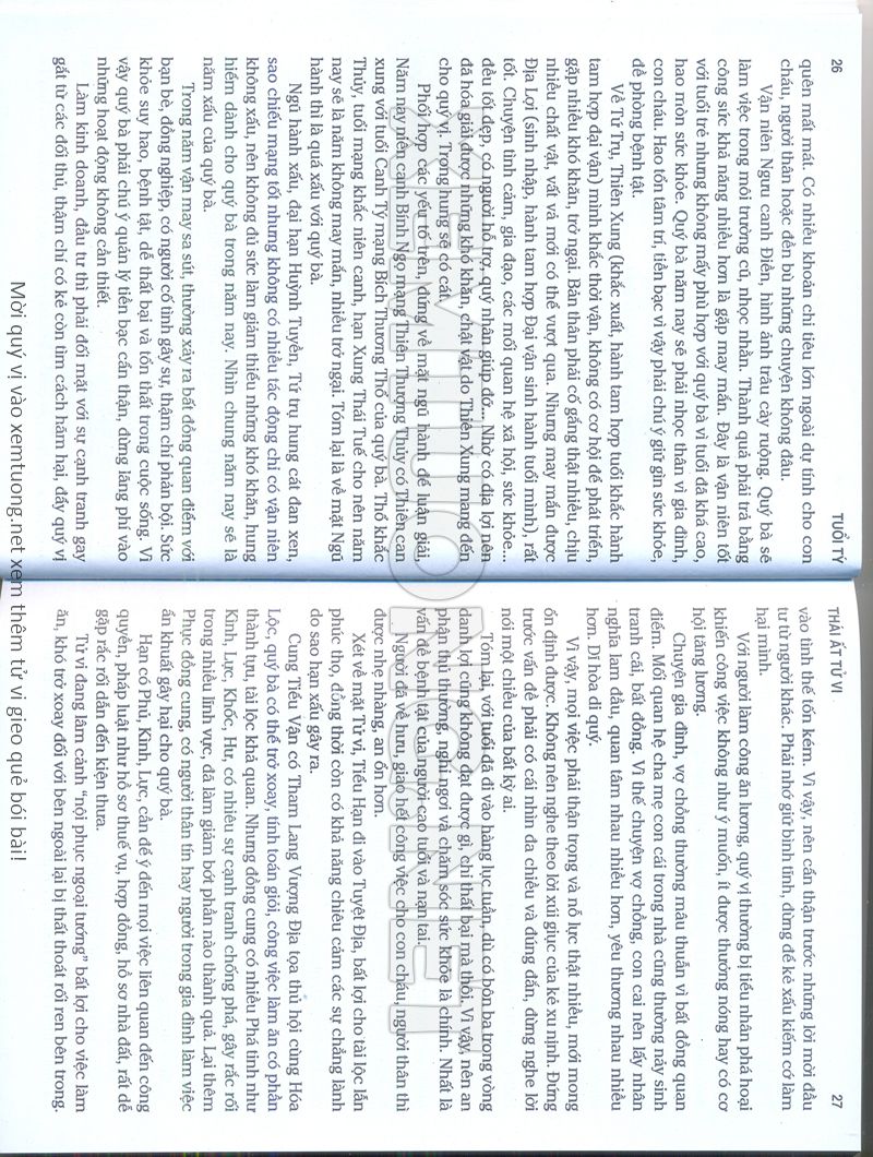 (Lưu ý: Thái Ất Tử Vi được chúng tôi scan từ sách, do đó mỗi tuổi sẽ có nhiều trang, quý vị xem xong hãy nhấn vào trang tiếp theo để xem hết phần tuổi muốn xem. Nếu quý vị xem bằng điện thoại thì hãy kéo qua lại để xem phần bị khuất.)