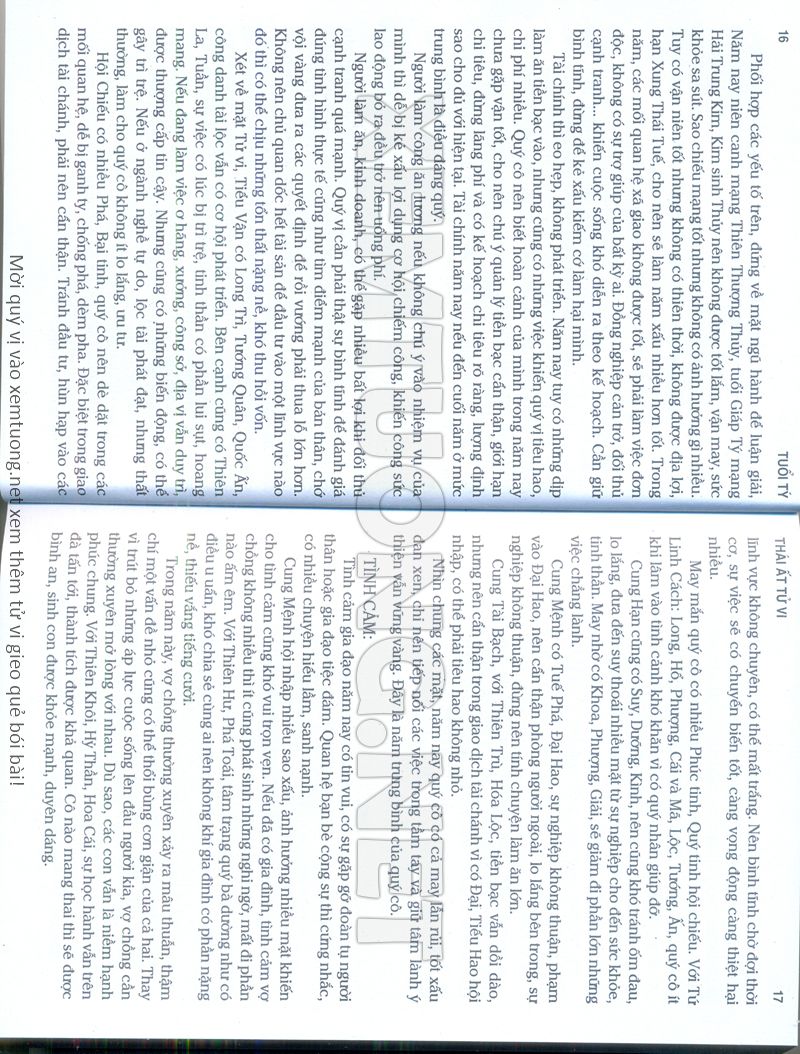 (Lưu ý: Thái Ất Tử Vi được chúng tôi scan từ sách, do đó mỗi tuổi sẽ có nhiều trang, quý vị xem xong hãy nhấn vào trang tiếp theo để xem hết phần tuổi muốn xem. Nếu quý vị xem bằng điện thoại thì hãy kéo qua lại để xem phần bị khuất.)